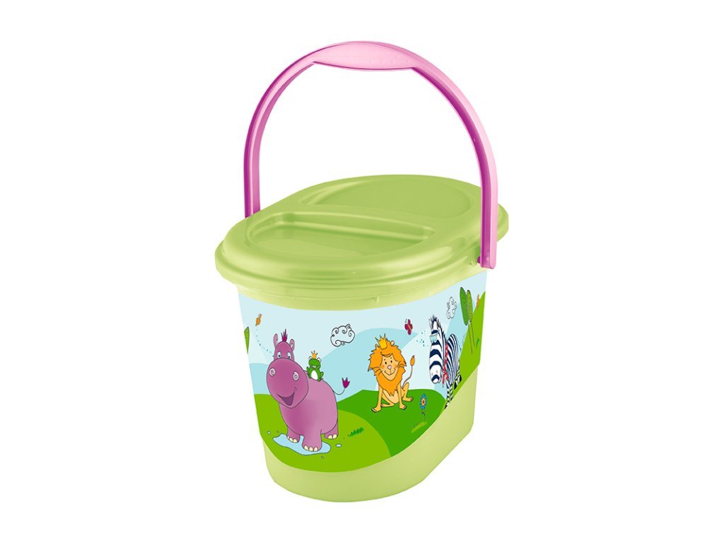Kyblík na použité plenky, nebo prádlo. Víko zabrání úniku zápachu z namočených plenek. Díky držadlu lze jednoduše přenášet. Ve stejné kolekci můžete, taktéž dokoupit vaničku, desku na wc, stupínek a nočník , přebalovací podložky, lehátko a to vše ve stejné protiskluzové kolekci.