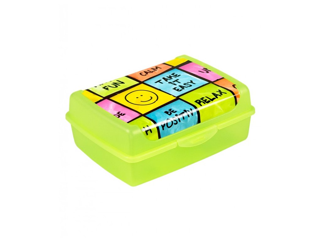 Uzavíratelný, svačinový, plastový box s obrázkem. V batohu, nebo tašce zabere málo místa a potraviny zůstanou neporušeny a také nevypadnou ven díky kvalitnímu uzávěru. Box je dostatečně pevný a pružný a snese i hrubší zacházení. Výrobek neobsahuje zdraví škodlivý uhlovodík BPA .