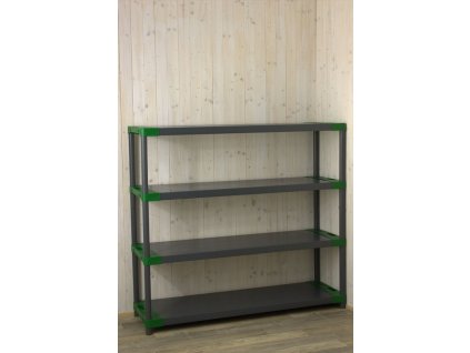 Praktický plastový regál Jupiter je kompletně vytvořen z tvrzeného plastu bez použití jakýchkoliv kovových spojovacích dílů. Plastový policový regál tvoří tři základní elementy: stojny, police a bočnice polic. Stojnou plastového regálu Jupiter je plastová trubka o průměru 40 mm a délce 420 mm,. Pracovní plochu regálu tvoří 50 mm vysoký plastový výlisek. Tato plastová police je vevnitř dutá a opatřena vodítky pro případné nasunutí výztuh. Těmito, už kovovými výztuhami, lze nosnost police plastového regálu Jupiter zvýšit až na 160 kg. Tyto výztuhy jsou v nabídce pro regály o délce od 100 cm výše. V tomto případě se jedná o regál se čtyřmi policemi. Samozřejmě konstrukce plastového regálu Jupiter umožňuje sestavit i 10 a více polic na regál, ale omezuje nás nosnost plastových trubek a celková stabilita takto vysokého regálu. První police je umístěna 50 mm nad podlahou. Odolný plastový policový regál Jupiter je v tomto případě v barevné kombinaci šedých plastových trubek i polic a červených, plně probarvených bočnic.