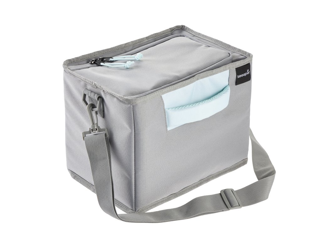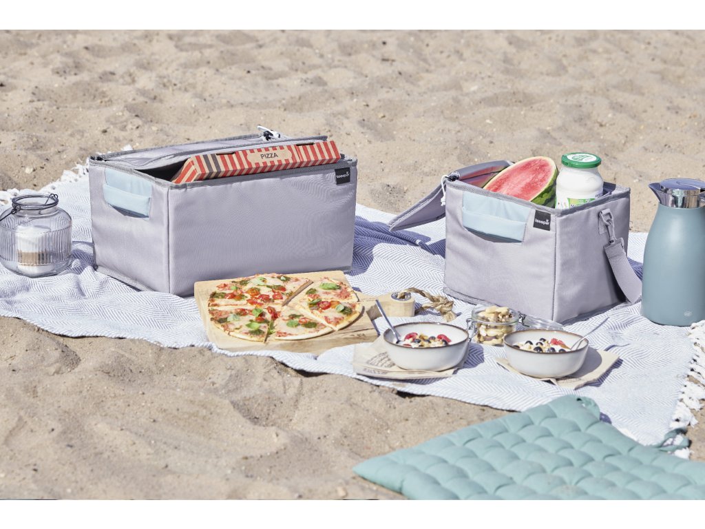 Skládací izolační taška v barvě šedé s prvky v akvamarínové barvě o rozměrech 29,5 x 20 x 22,5 cm a objemu 13 l se vejdou do koše na kolo nebo se dají pohodlně nosit pomocí nastavitelného ramenního popruhu. Ať už se jedná o potraviny, láhve nebo cokoli jiného, izolační taška je prostorná a udrží obsah studený nebo teplý po dobu 4 hodin.